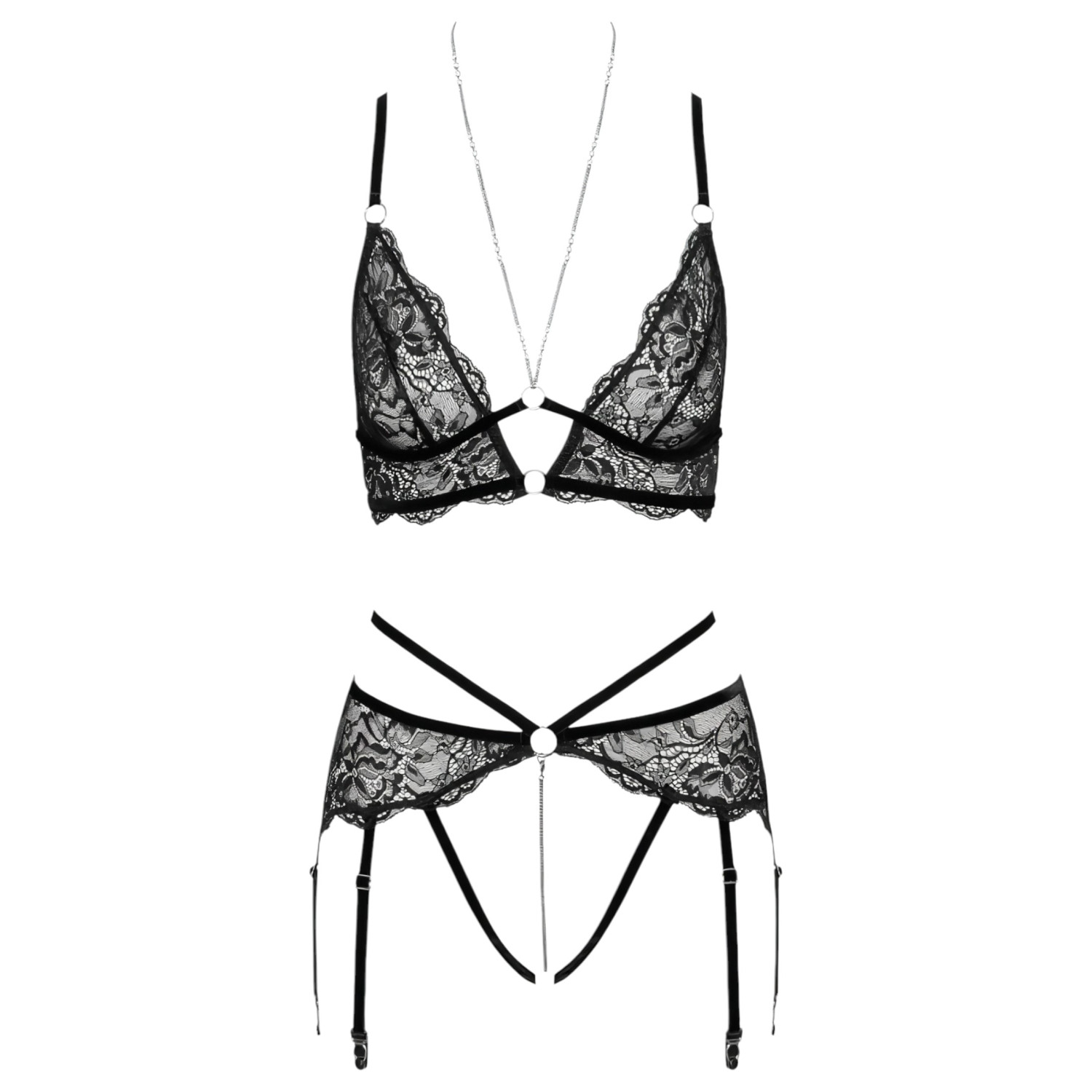 Das sexy Dessous-Set aus Spitze entfacht garantiert das Verlangen. Die weiche, bequeme Spitze schmiegt sich sanft an die Haut, während der offene Slip und BH aufregende Details offenbaren. Die silberne Kettenverzierung verleiht dem Set einen besonderen, provokanten Glanz, der wie ein Schmuckstück am Körper schimmert. Die Strapse verstärken den sexy Look weiter, wodurch es die perfekte Wahl für einen heißen, intimen Abend ist.