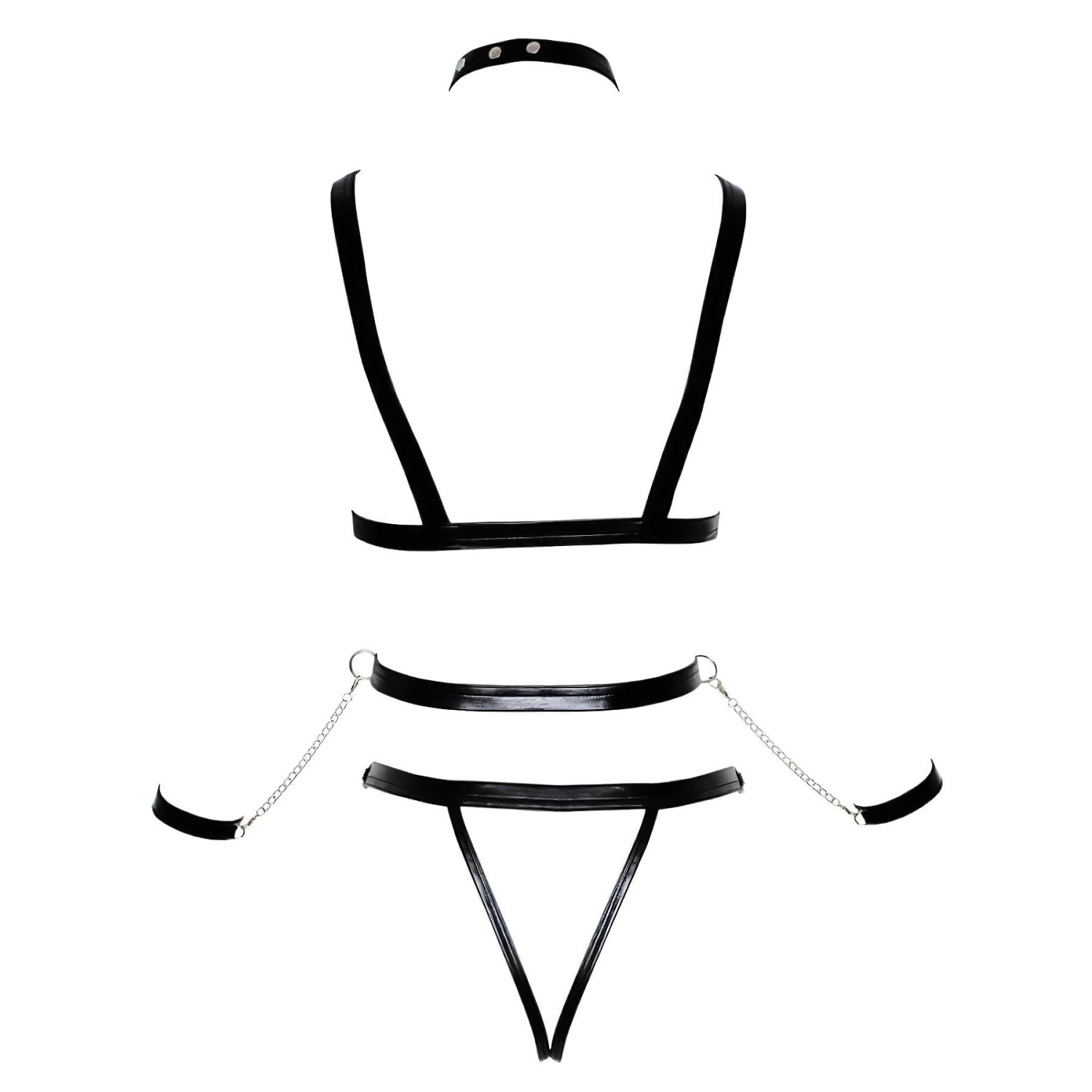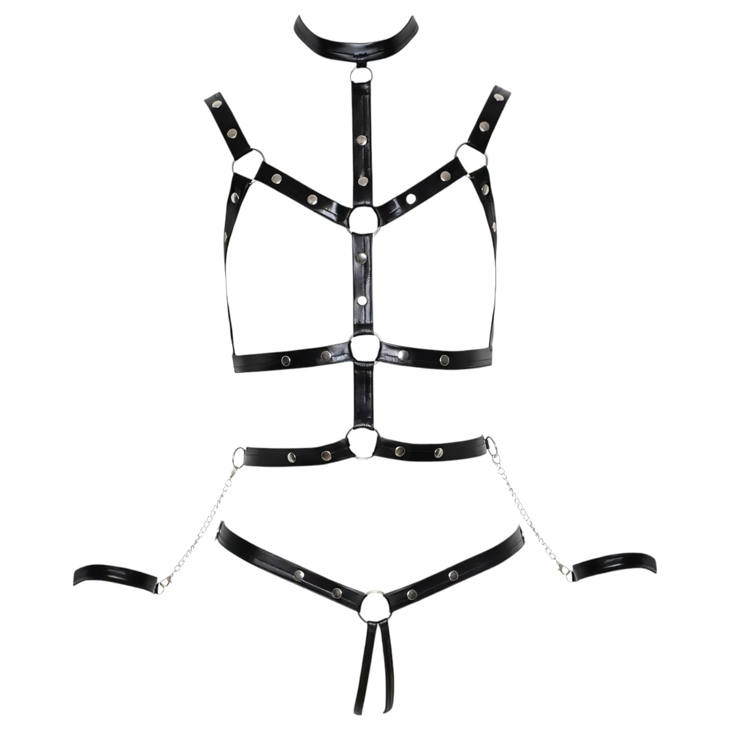 Entdecke die Welt der Verführung und des Bondage mit diesem speziellen, zweiteiligen Harness-Body, der mit dekorativen Nieten verziert ist.