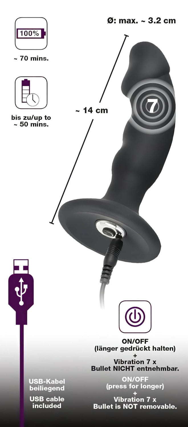 • Betont ausgearbeitete Spitze für intensive Stimulation der Prostata oder Vagina
