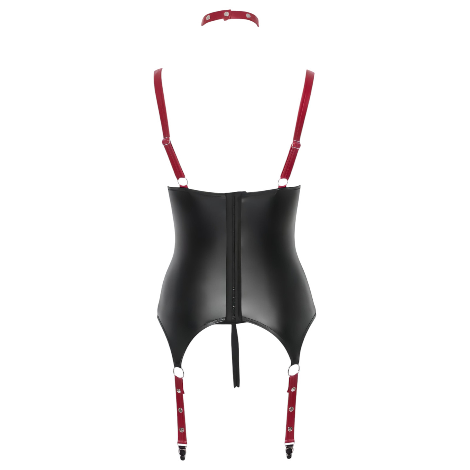 Verführerische rote Riemen, glänzendes schwarzes Material und Nieten-Details - dieses Dessous-Set bringt Verführung und Dominanz perfekt in Einklang.