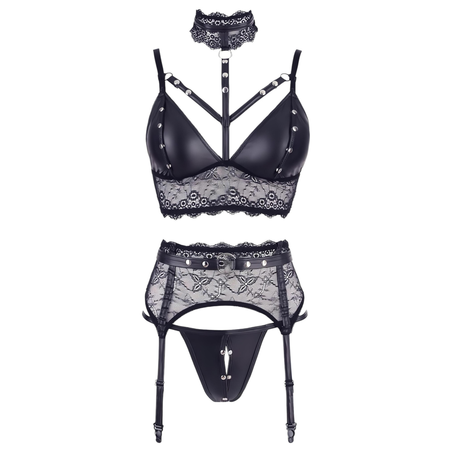 Set aus glänzenden Trägern und weicher Spitze, verziert mit Nieten - für einen Auftritt, der wirklich besonders ist!
