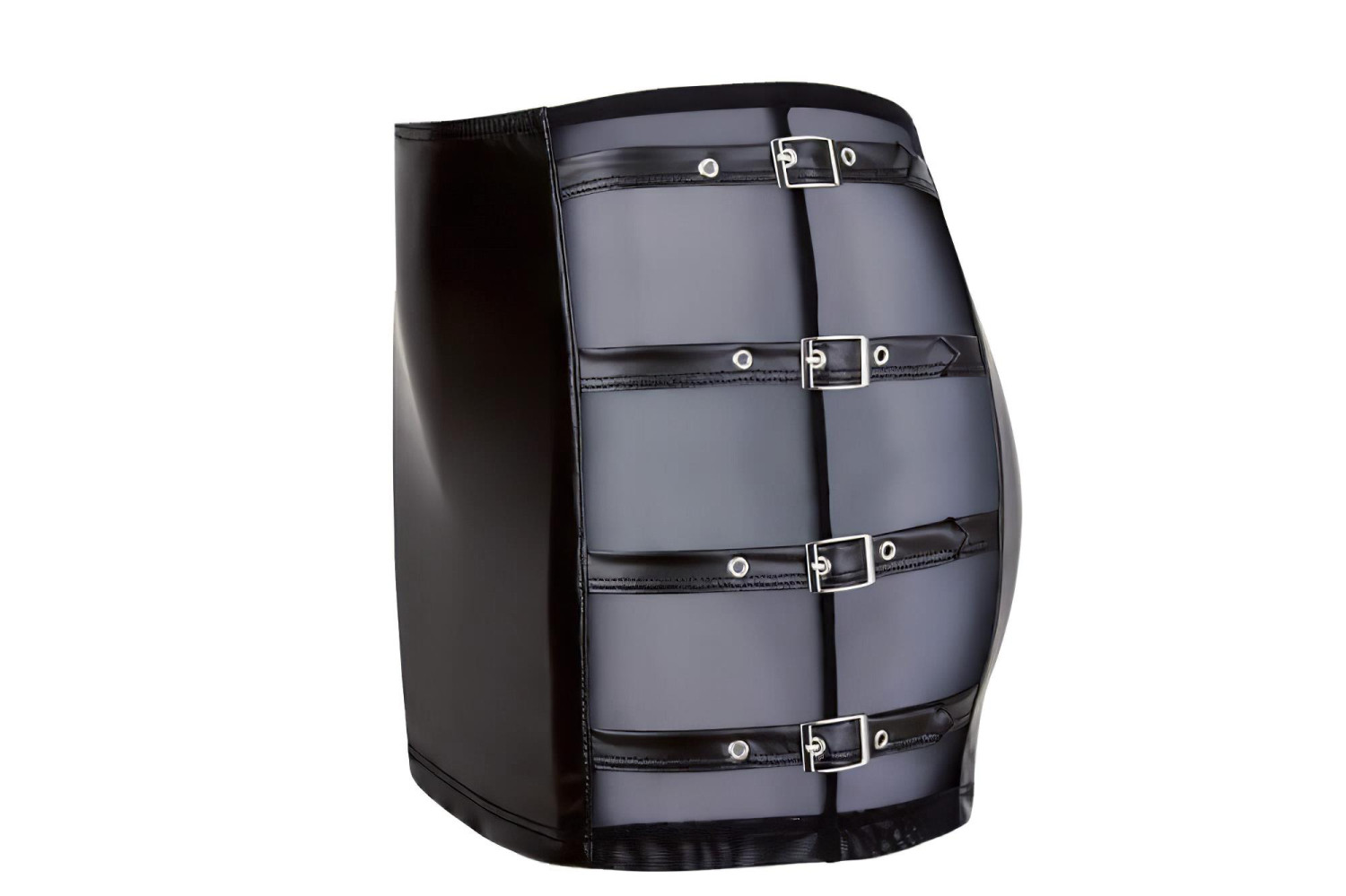 • 1x schwarzer Minirock mit transparenten Netzeinsätzen und Metallverschlüssen.