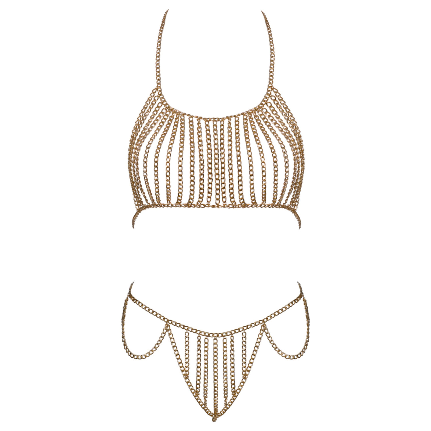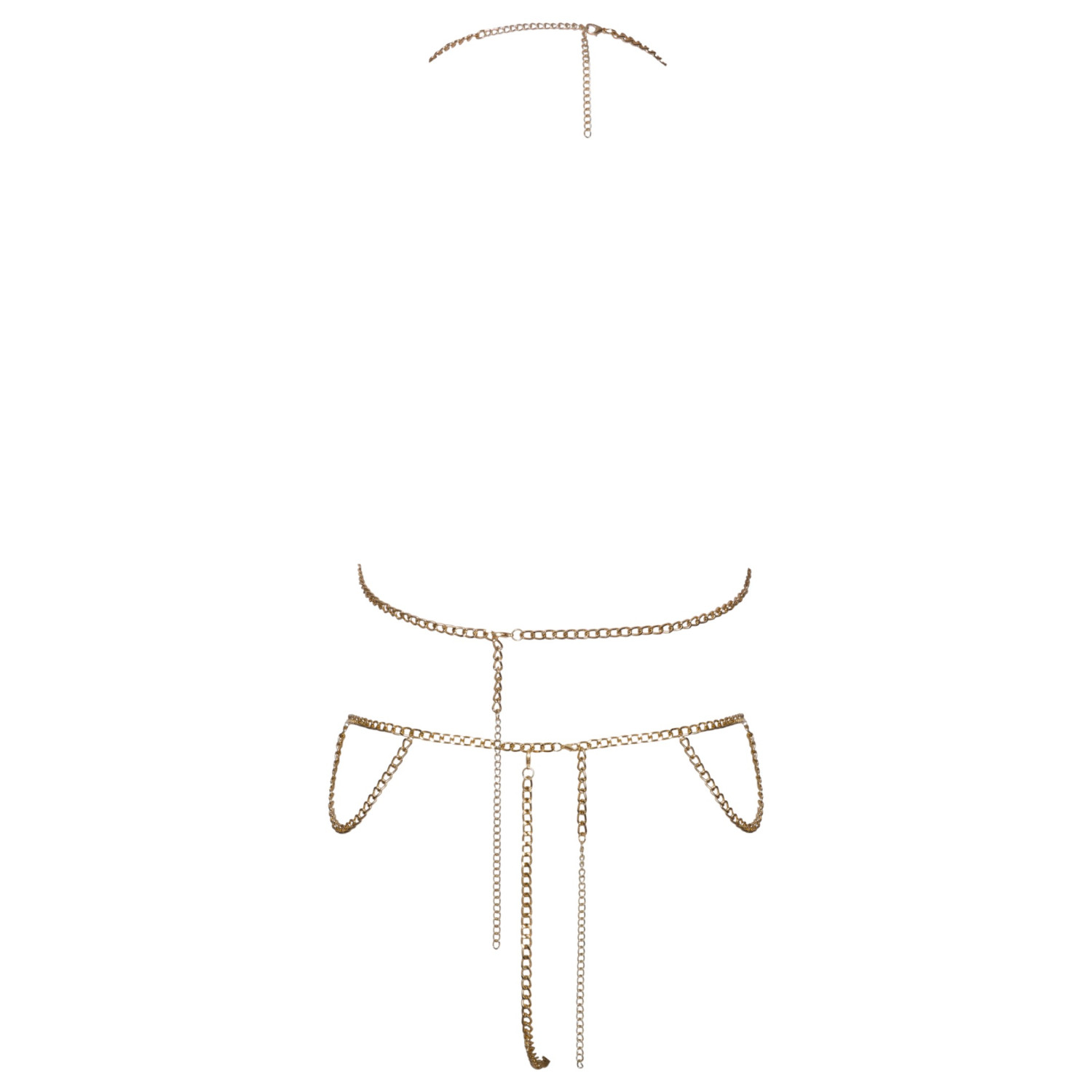Der Cottelli - Kettenkörperschmuck (Gold) ist ein luxuriöser, erotischer goldfarbener Ketten-Bikini mit Neckholder-Träger, verstellbaren Rückenketten und stimulierender Intimkette, der für einen spektakulären, glamourösen Auftritt sorgt.