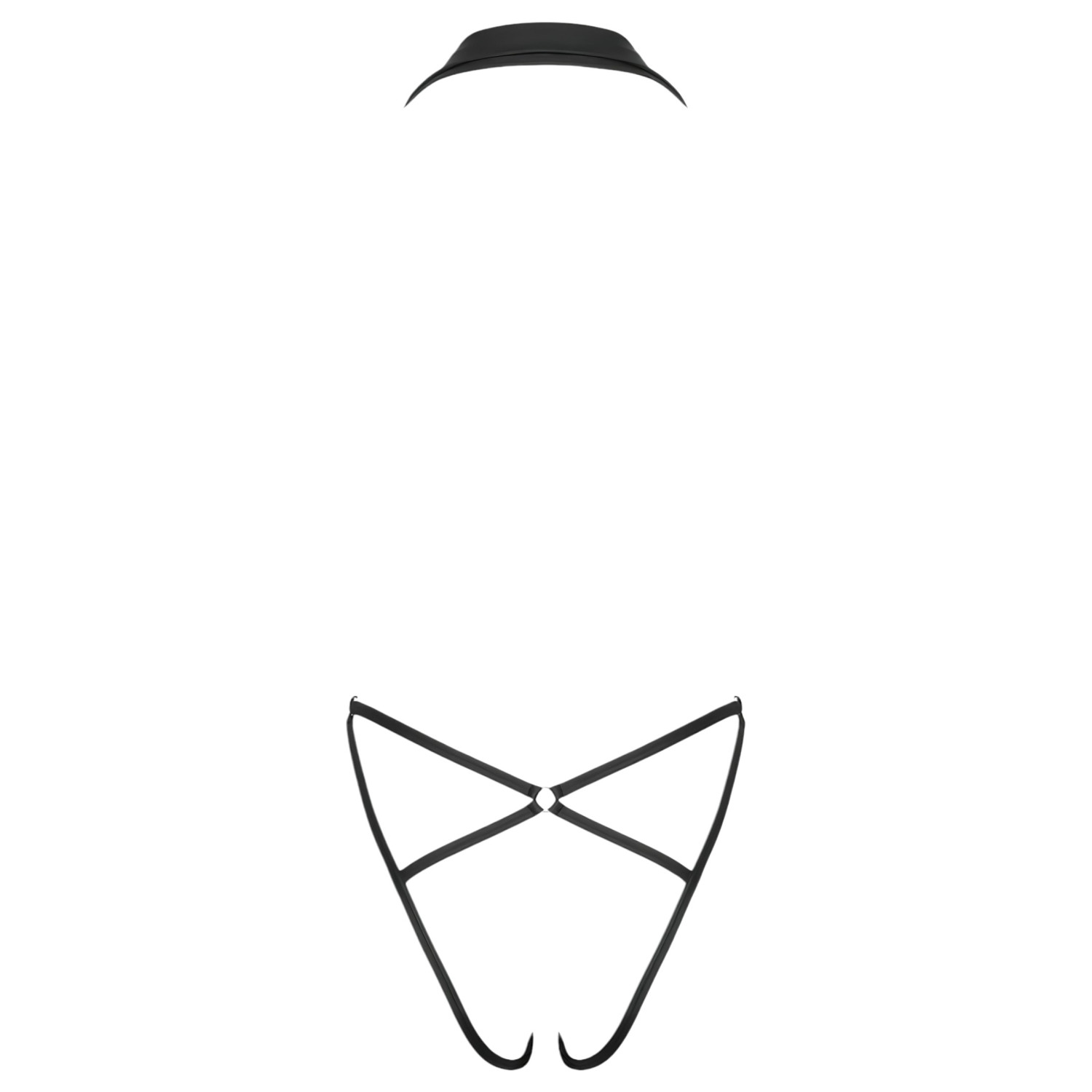 Glänzender, sexy Body mit extra tiefem Dekolleté, am Po nur mit ein paar elastischen Bändern und einem eleganten Kragen!
