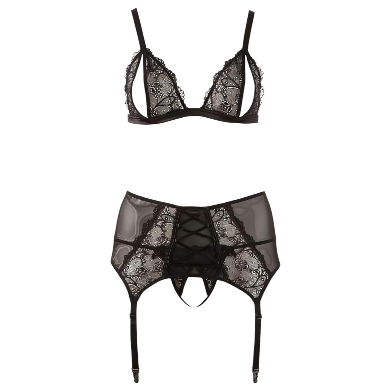 • Verführerisches Design: Offen geschnittener BH, der die Brüste freilässt, und ein Strapsgürtel mit Satin-Schnürung vorne sorgen für einen extra sinnlichen Look.