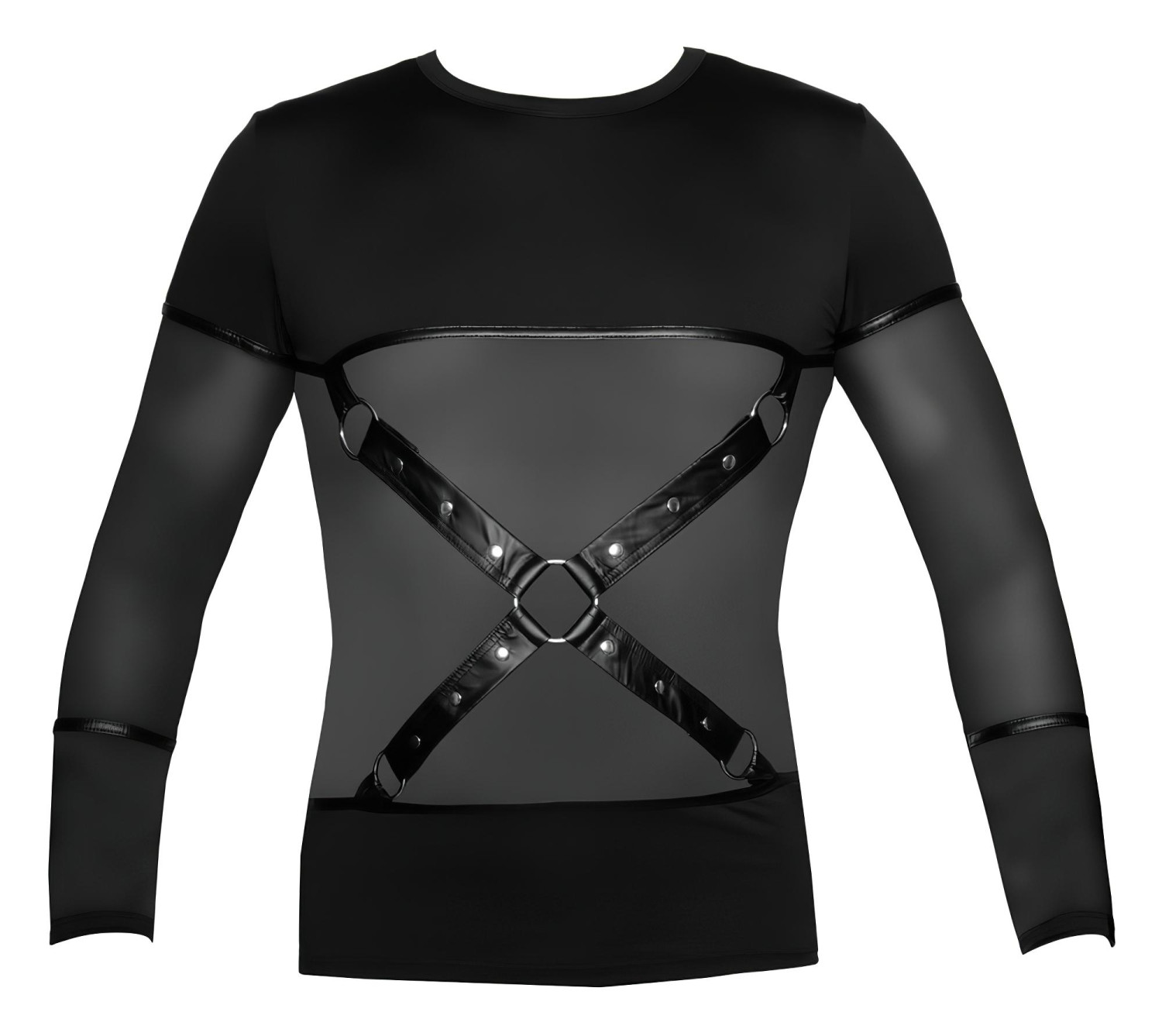 Sexy, seidig-weiches Oberteil für Herren mit überkreuzten Trägern und transparenten Netzeinsätzen.