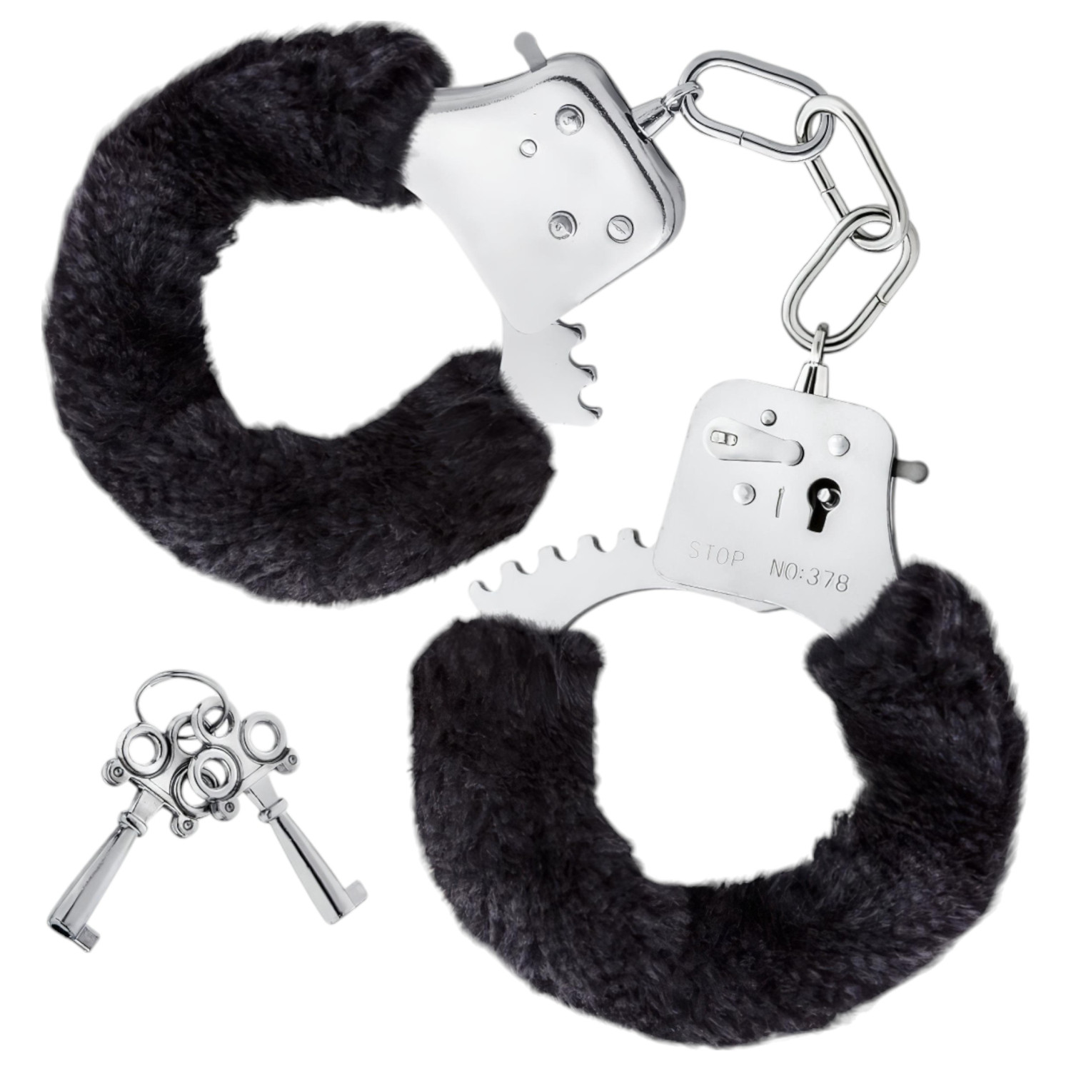 • 2 Metall-Handschellen mit abnehmbarem Plüschüberzug, verbunden durch eine kurze Kette